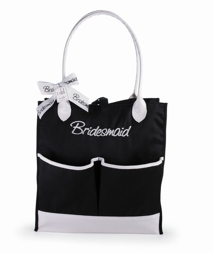 - Bridesmaid Pocket Tote A classic black and white wedding party tote features 4 oversized pockets and "bride" embroidery. Faux leather shoulder height handles. There is also a small zipper closing pocket on the inside. This darling tote ties closed with a grosgrain ribbon. 22" x 131/2"